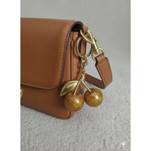 This Beautiful Cherries Keychain is a stylish accessory for women's purses. The keychain features a colorful cherry design in a elegant gold color, making it a charming and eye-catching addition to any purse or set of keys. Perfect for adding a touch of femininity to your everyday accessories, this keychain is both practical and fashionable. Ideal for women who appreciate unique and playful details in their accessories.