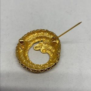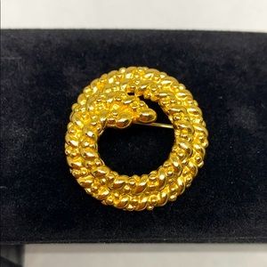 Circa 1970’s, this brushed gold plated pin is in excellent condition. It’s approximately 1 1/4” inches in diameter. Understated and elegant, this would look beautiful on almost anything you wear. Marked Dior on back.