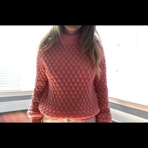 This sweater is so warm and such a pretty pink! Only worn once or twice. I was trying to wear bright colors but it’s just not me! Great condition comes from a smoke and pet free home.