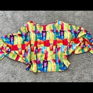 Beautiful Colorful Top. Top has bat sleeves & stops @ end of waist. Slightly off the shoulders. Runs slightly big. 65% Poly 35% Spandex