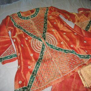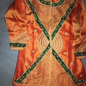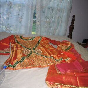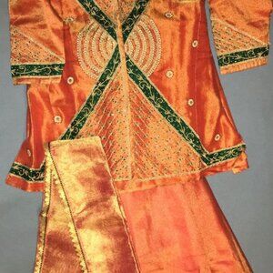 Beautiful Copper Lehenga with Green accents and pearl / zari styling. Upper Hip/ Waist length top with gorgeous skirt bottom and dupatta.