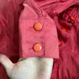 Unique blouse from Turkey. Coralish color. The details are beautiful. Floral flowers around v neck. Diagonal buttons that scrunch the material. Feminine waist. No flaws! Honestly lovely.