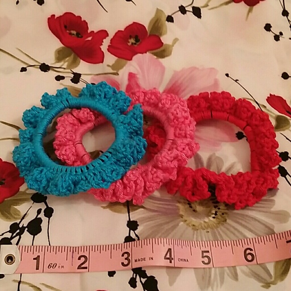 Beautiful Crocheted Cotton Scrunchie Set!! Will wrap up to three times!! Deep turquoise, Hot pink, Red!
