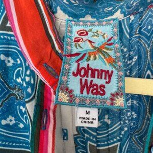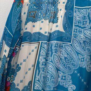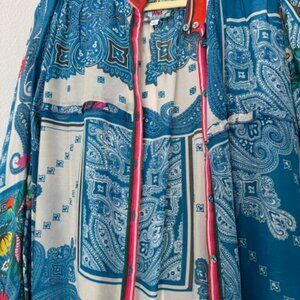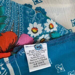 This blouse has amazing colors, and the fabric is breathable. The neckline can be worn open or closed with all covered buttons. The pintuck on the top back creates a unique feature. The long sleeves have a loose-fitting elastic band at the hand.
