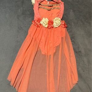 This is a lyrical or contemporary dance costume, featuring a coral-colored leotard base with an attached sheer skirt and floral appliques.