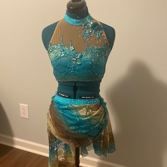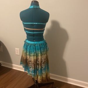 Beautiful Custom made lyrical Costume. Ombré material..teal to browns. Has flower details and is Trimmed in Swarovski stones. Approx size AS/AM