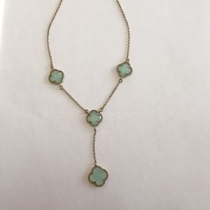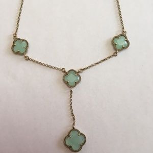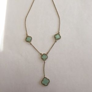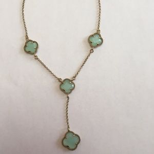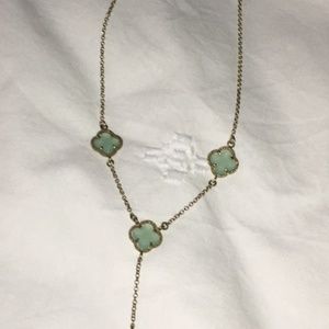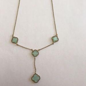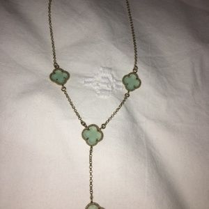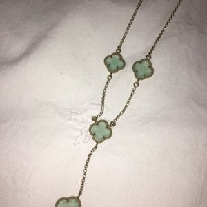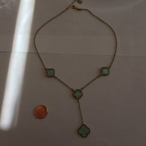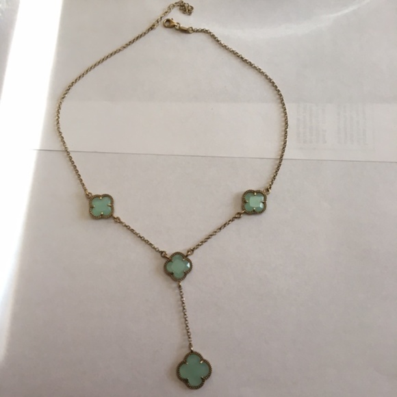 Gold-tone and greenish-blue stones and a drop. I received so many compliments on this necklace.