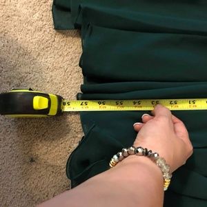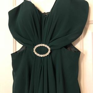 Beautiful dark green formal gown. This color will set you apart from the crowd. The gorgeous rhinestone focal piece brings attention to the cutout sides and back. Button and zip closure on back, slit in front as pictured, covered by layered fabric. 57" in total length, slit is 20". Normal wear- needs regular cleaning.