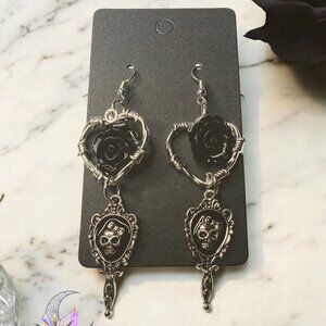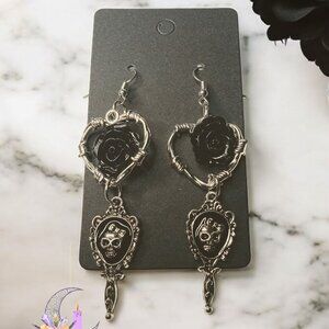 These beautiful dangle earrings feature antique hand mirrors with skull charms attached to stainless steel hearts with resin rose beads.