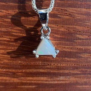 This stunning necklace is handmade and features a beautiful diagonal patterned triangular cut opal as the main stone. The pendant hangs elegantly on an 18-inch spiga/wheat chain. The necklace is made of 925 silver and is perfect for any occasion. It is a statement piece that will surely enhance your beauty fashion.