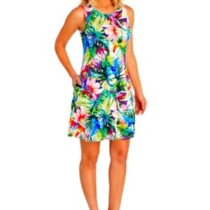 New with Tags! Cupio Floral swing dress, women's size Small, lightweight relaxed design, sleeveless, round neck, unlined, side seam pockets, very soft material w/ stretch, 95% viscose/ 5% spandex, machine washable, measures approx. 16" from underarm to underarm & 32" top to bottom, perfect unworn condition!