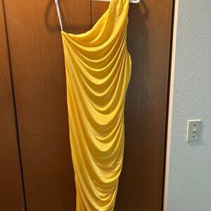 Has an asymmetrical hemline, stretch knit matte jersey.