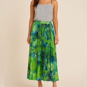 Pleated Midi Skirt is a lush explosion of green and blue botanical prints, cascading into soft pleats that flow effortlessly with every step. The lightweight, airy fabric offers all-day comfort for your elegant chic look.