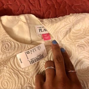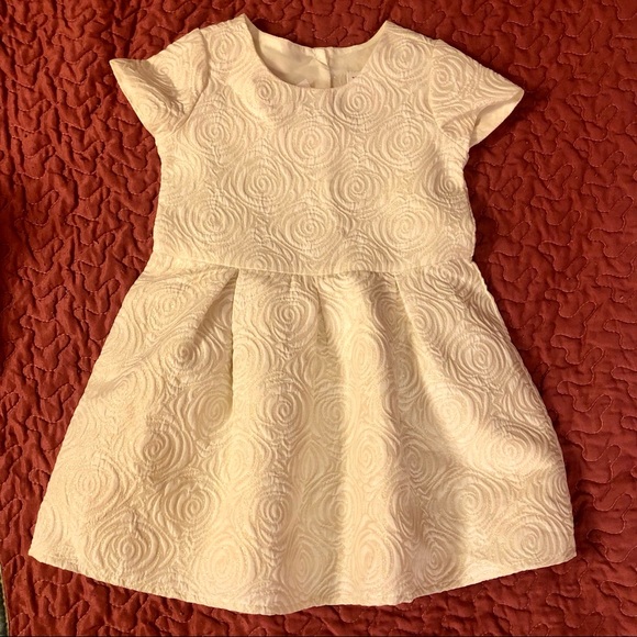 ✨Beautiful short sleeve, cream-and-gold dress with embossed swirls and button up back closure. Perfect for Easter! NWT. pet free, smoke free home.