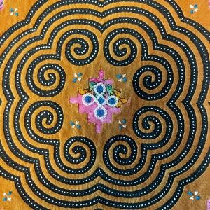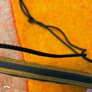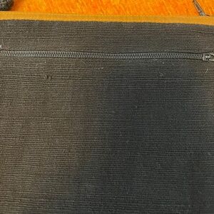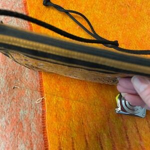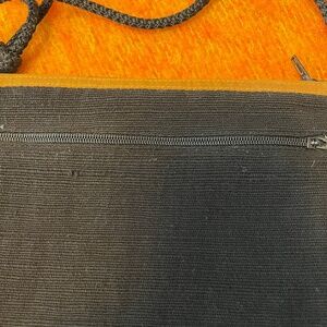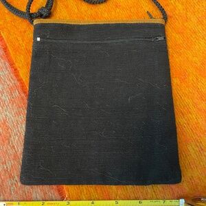 This one of a kind fabric cross body bag is lightweight but study. It features an intricate stitched design, zipper top (as well as back zipper pocket) , and stretch woven cord strap.