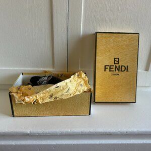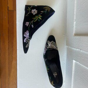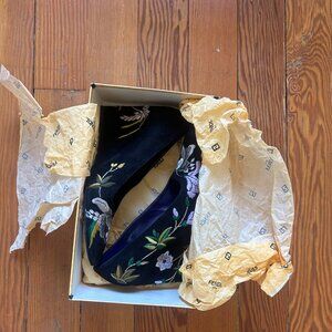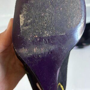 Beautiful, in great used condition, Fendi black suede wedges with silver, lavender, gold, and green floral embroidery. Worn only twice. Comes in original box with tissue paper. Size 7.5