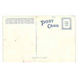 This vintage postcard features a lush garden estate in Florida with vibrant flowers and tropical palms. Back includes text on Florida's subtropical scenery.