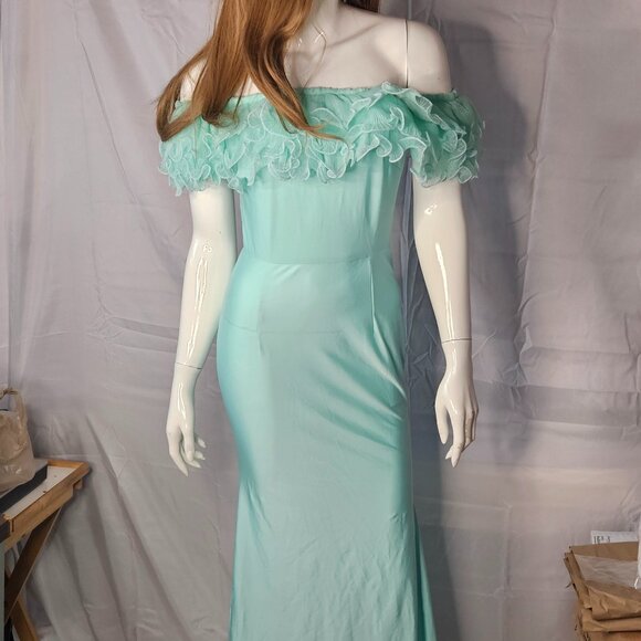 The Beautiful Faeriesty Dress in Mint Green is a stunning gown perfect for various occasions such as parties, casual outings, or formal events. This sleeveless dress features an off-the-shoulder design, long length, and a solid pattern. The dress has a zip closure for easy wear and is designed for a regular fit in size M. Made in China, this gown is a beautiful choice for the summer and spring seasons, adding a touch of elegance to any wardrobe.
