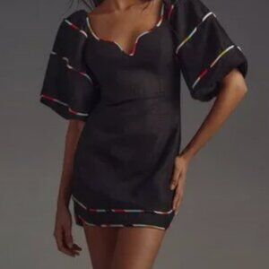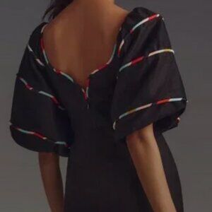 New - never worn!! This sustainable mini dress features a playful V neckline, invisible zipper at the center back, and flattering elbow-length sleeves. Made with a fun black colored stripe print, it's a versatile piece for any occasion. Get ready to turn heads with this soft and stylish dress.