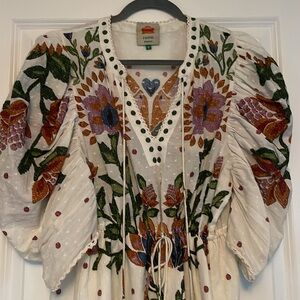 Farm Rio mini dress; cinched; beaded pull waist. Beaded tassels; gorgeous colors; puff sleeve. Excellent condition; worn twice
