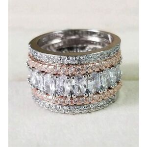 Beautiful fancy 5 row CZ ring in rose gold and silver with gorgeous multi shaped CZs including diamond shaped and rounds in a gorgeous modern design. Size 8
