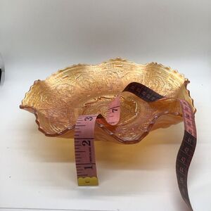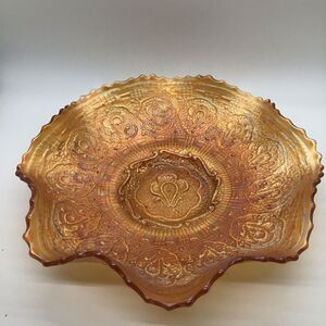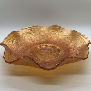 Unmarked Fenton Persian Medallion ruffled edge carnival glass bowl in Marigold color. Iridescent and so beautiful. No chips or cracks.