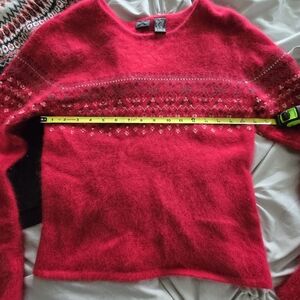 One Y2K red fuzzy (Exhilaration) sweater worn a couple of times. One Croft & Barrow black sweater. Worn one time on Christmas. I washed it and it has some piling. I would keep it if it wasn't the piling type of material. See up close last pic. Smoke free home.