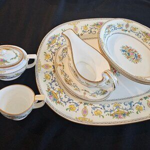 This product is a set of 12 fine bone china settings, featuring a Talbot pattern with a multicolor design on a cream background. Made by the renowned brand Minton in England, these pieces exude elegance and sophistication. The intricate craftsmanship and high-quality material make them a valuable addition to any dining table or collection of vintage dinnerware. These antique Minton English bone china settings are a true testament to the beauty and excellence of British craftsmanship. R.F.C. #735348, produced in 1928.