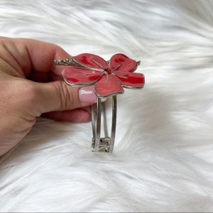 Metal Floral Cuff Bracelet 7”. Beautiful cuff bracelet with multi colored metal flowers and a small rhinestone. This opens with a simply pull/ pressure. Very comfortable to wear as well. This is in excellent pre owned condition with no flaws.