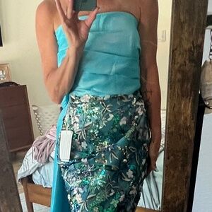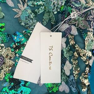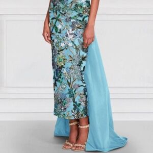 Floral Embroidered Column Evening Gown Elegant Dress Formal, Floor Length, Short Sleeve Off Shoulder Satin with Slit