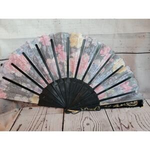 Beautiful Floral Gold Accents Black Lace Womens Fan Vintage Collectible in good condition does have some wear and discoloring