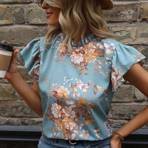 Cute Ruffle Neck Floral short sleeve Blouse. Perfect for work or play. Looks good with some work trousers or unde a suit. Wear with your favorite jeans, shorts or skirt too.