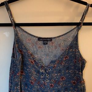 This gorgeous tank is great for Fall, Spring, and Summer! With adjustable straps, you can make this pretty tank into any length you prefer. This tank is flowy but fits right, it has a gorgeous floral design and cool tie-up in the center. It is a super light material and overall a gorgeous top with pretty pastel flowers!