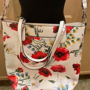 Beautiful floral tote by Dana Buchman. 13”L by 15”W. Faux leather with inside snap and large zippered safe spot & small zipper pouch for makeup. Long strap is removable for a carry tote