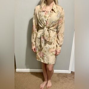 Beautiful vintage two piece dress and shirt set. Dress is sleeveless, somewhat between a shear and an A-line. The hem hits at a flattering above the knee length. The matching shirt is a button up long sleeve, extra long. Each piece can be worn alone or in a variety of ways together.