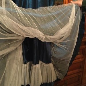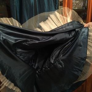 Gorgeous ornately decorated, mermaid style, full length gown. teal green color with gold embellishments. Dress has two layers of built in crinoline at the bottom with an added layer of fabric to keep crinoline away from the body.