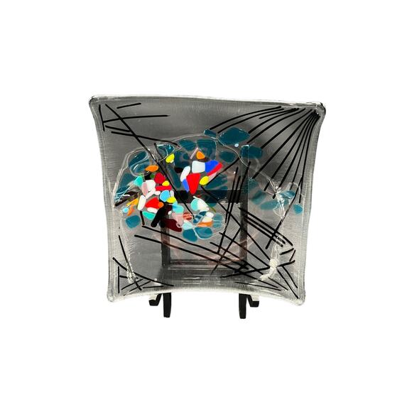 Beautiful Fused Glass Bowl Blues Reds Blacks Square w/ Corners Turned Up - EUC