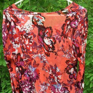 This beautiful gauze like top is 100% Rayon. It has a coral colored background, with flowers in brown, cream, magenta and blue. It would need to be worn with a camisole underneath, & would be airy & cool on a hot summer day. It would look stunning worn with a black cardigan in the fall, It could also be dressed up with beads for the evening. The crinkle look makes it ideal for travelling & it would barely take any room! A versatile top, that will get compliments, & can be worn anywhere!