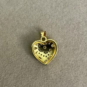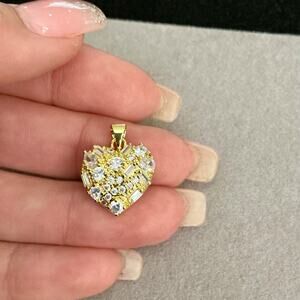 This Beautiful Gold Heart Nugget Pendant features a simulated white/colorless main stone in a baguette shape, set in yellow gold filled metal with a sterling silver base. The pendant exudes beauty and love, making it suitable for any occasion. With a heart-shaped design and a diamond color grade of D, this charm pendant is a stunning and elegant accessory that can add a touch of romance to any outfit.