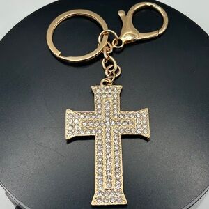 Elegant gold keychain featuring a crystal-studded cross. Perfect for adding a touch of sparkle to your accessories.