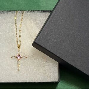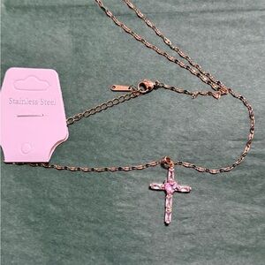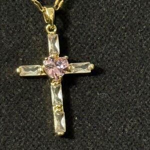 Beautiful Stainless Steel Cross Pendant Necklace with Pink Heart-shaped Synthetic Zirconia.