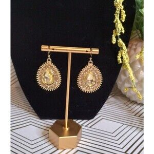 These Beautiful Gold Tone Geometric Gold Stone Earrings are a stunning accessory for any occasion. The earrings feature a gold main stone in an oval shape, accented with rhinestones for added sparkle. The gold tone metal adds a touch of elegance, making these earrings a perfect choice for a feminine touch to any outfit. The earrings are not vintage and have not been personalized, offering a timeless and trendy style for the modern woman. Perfect for a jewelry set, these earrings are a must-have addition to any jewelry collection. SMOKE FREE HOME