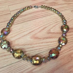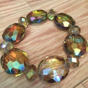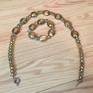 This beautiful iridescent set has a golden hue to it. What makes it amazing is that it picks up the colors of whatever you are wearing. It has a slight pinkish purple hue to it with specs of greens and Amber. It's a one of a kind piece. Necklace closes with a silver clasp and measures 20 inches in length. Bracelet is one size and stretches with an inner elastic band. NWOT.
