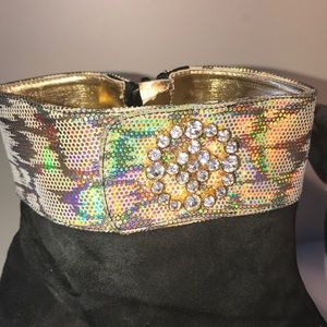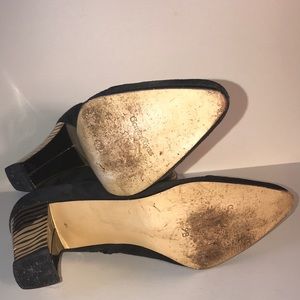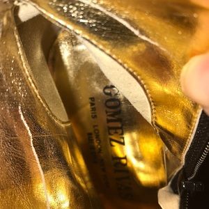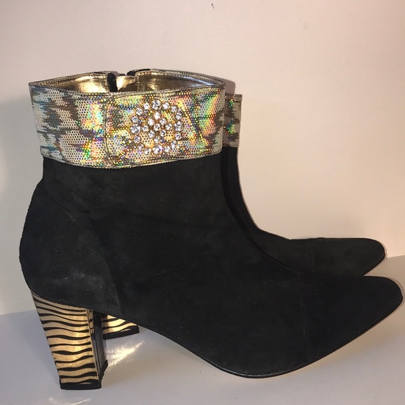 Very beautiful bootie unique design! Made is Spain. Black suede, gold leather inside, beautifully made. This was a lovely designed boot. A great add to any outfit!