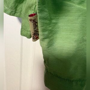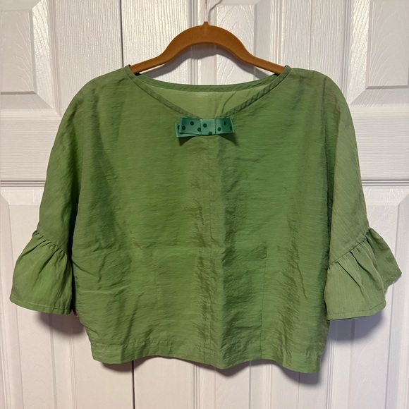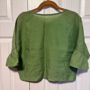 Lightweight green top with short ruffle sleeves. Soft drape and relaxed fit for everyday wear. Versatile style that pairs easily with jeans or skirts. Fabric is like lightweight silk.