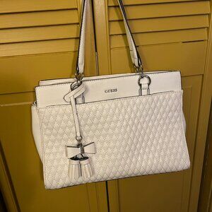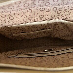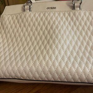 Beautiful Guess Quilted Tote bag , Bag is made of faux leather with quilted diamond pattern, Snap front pocket. 4 pockets inside , 9 1/2in x 13 1/2 in ex condition