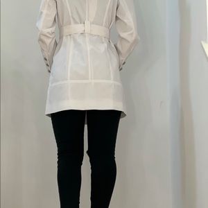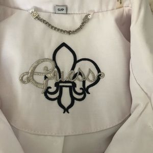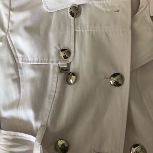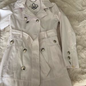 White Guess Jacket with removable hoodie and belt. Silver buttons. Like new.