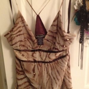 Brown with gold sequins. Racer back super sexy. Worn I think twice but in perfect condition. Has a side zipper.