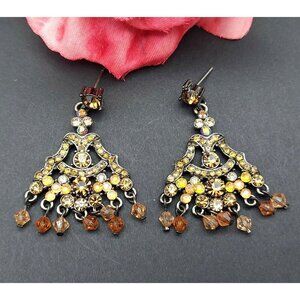 Beautiful Gunmetal Amber Crystal Brown Chandelier Statement Earrings Pierced