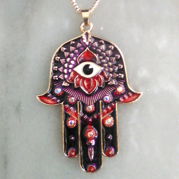 Beautiful HAMSA "Hand of God" Purple Enamel Rhinestone Art Pendant & Necklace